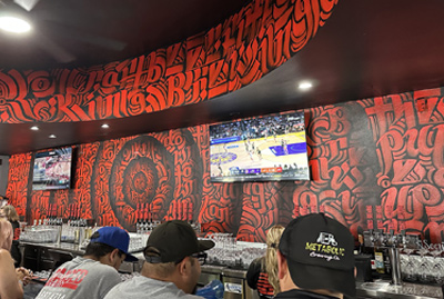 Full interior build-out across five surfaces: main bar wall, four ceiling soffits, and six canvases. Approximately 500 square feet of calligraffiti completed solo in four days. Scope expanded on-site after walking the space, original commission was the bar wall only.