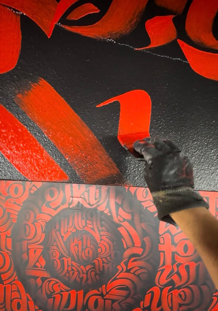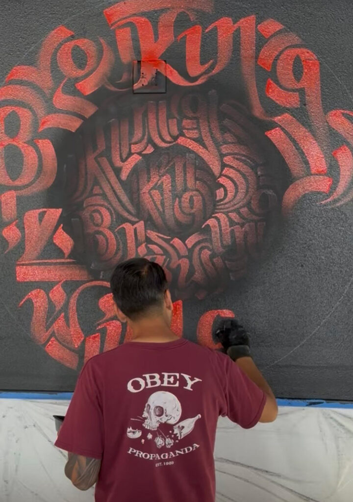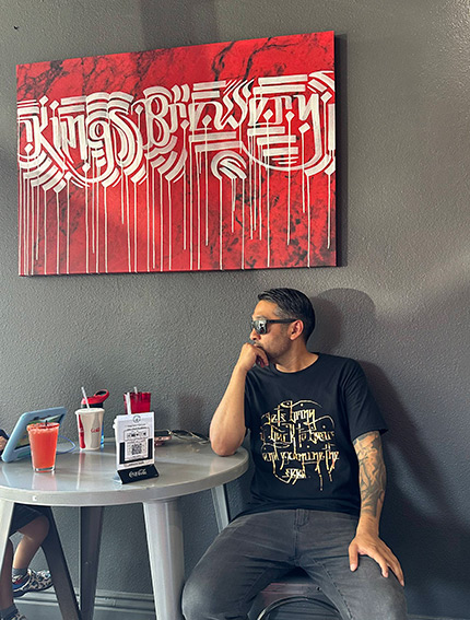No. Most of my work is freestyle — point me at a wall and I’ll work with what’s there. If you have colors in mind, tell me. If you don’t, I’ll look at the space and tell you what will work. You can also give me words, phrases, or messages to embed in the piece. That’s part of what calligraffiti does.
